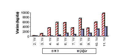 Şunu önemle belirtmek gerekir ki; M9 anacına aşılı çeşitler tam ve ekonomik verime 3. ve 4. yaşında geldiği halde; çok kuvvetli gelişen anaçlar üzerine aşılı aynı çeşitler 12-15. yılda gelirler. Bu nedenle, yatırımın erken yıllarda geriye dönüşünün sağlanması bodur anaç kullanmakla mümkün olur (Şekil 2).