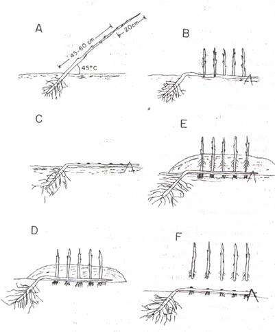 80-100 cm boyundaki bir yaşlı köklü damızlık bitkileri, ekolojik bölgelere göre, Aralık-Mart aylarında sıra arası 1.5 m ve sıra üzeri 25 cm aralıklarla, toprakla 45 0 'lik açı yapacak şekilde dikilir. Dikim esnasında 20 cm'lik tepe kısımları kesilir (Şekil 5 A).