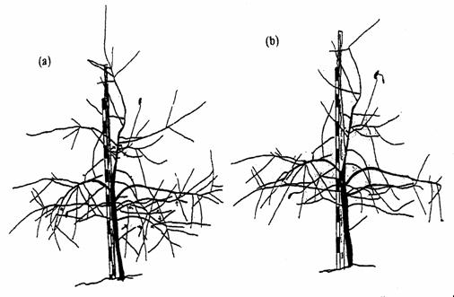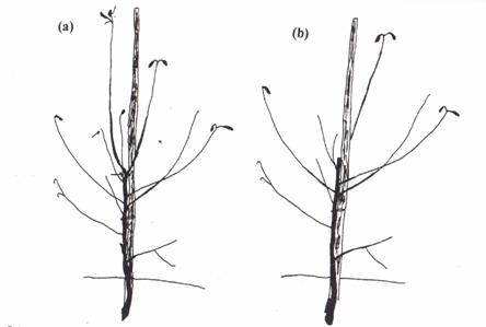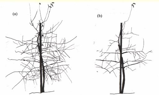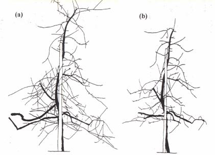 Şekil 13'de bahçe kuruluşundan itibaren özen gösterilmiş ve bunun sonucunda da ideal şekli almış dokuz yaşlı bir Golden Delicious ağacının budamadan önce ve sonraki durumu görülmektedir.
